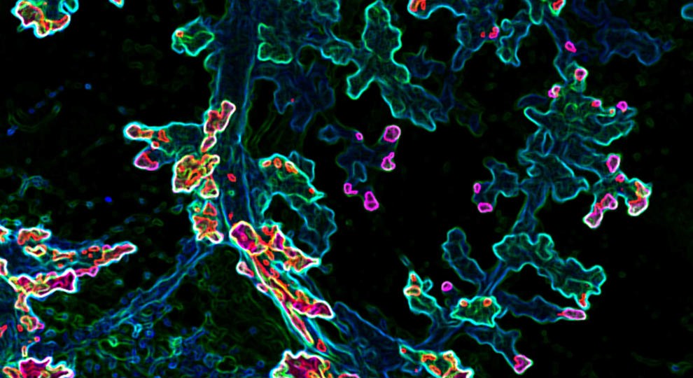 Maeve was niet de enige die direct een wereldbol zag in deze microscopische foto. “Het was opvallend dat anderen dezelfde associatie hadden, zonder dat ik ze erover verteld had”, zegt Maeve Grifhorst, stagiair in de onderzoeksgroep van Jacco van Rheenen. Een globe met een apocalyptisch randje dan wel. “Het lijkt inderdaad of de aarde in brand staat. En ik vond dat wel goed aansluiten bij hoe hard kanker het leven van zoveel mensen raakt.”