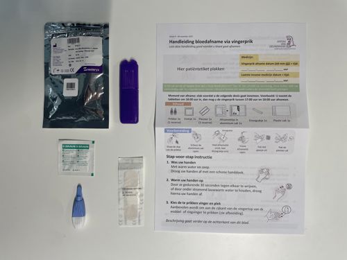 De handleiding helpt u stap voor stap om de vingerprik uit te voeren. Op het formulier in de handleiding schrijft u de datum en tijd dat u de bloedafname uitvoert en de datum en tijd van de laatste inname van uw medicijn. Stuur dit ingevulde formulier samen met het afnamekitje terug naar het AVL.